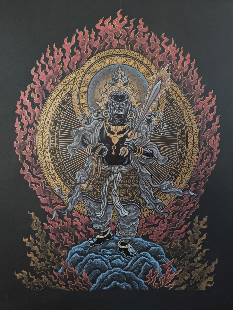 Fudo Myoo, Immovable Wisdom King. Color pencil on black paper, 22″x30″. As usual sharing these images online is a cruel insult, since the camera never comes close to showing the scale, the depth of hue and the play of light on the metallic gold pencil, which is used extensively here.
