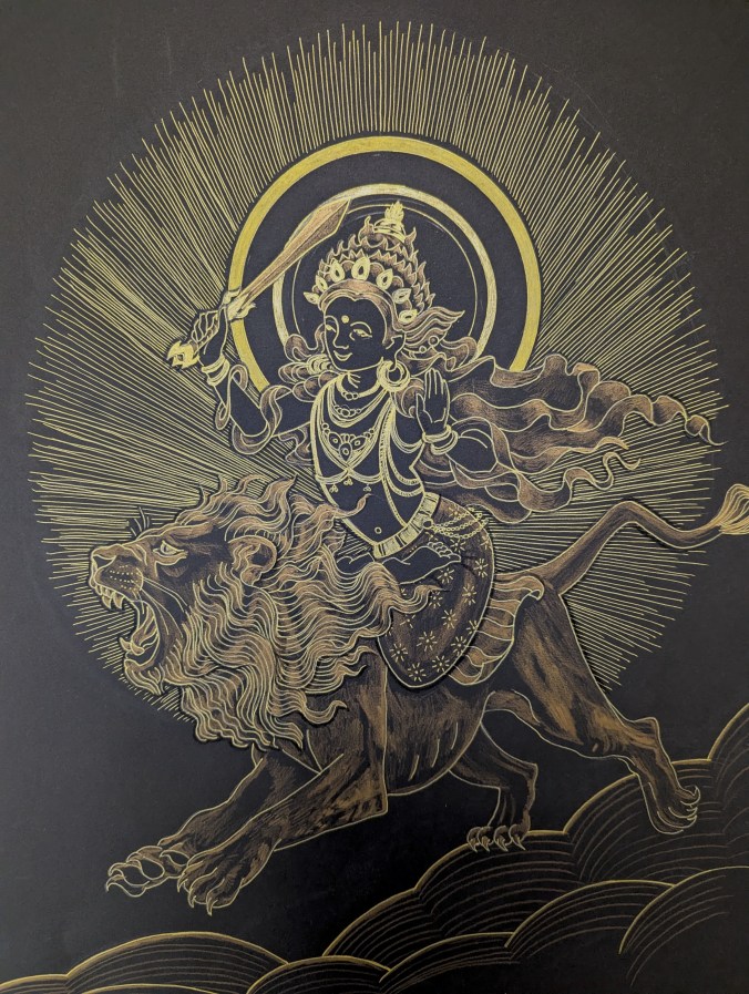 My drawings are particularly inspired by Himalayan and Japanese traditions of painting on black backgrounds, making special use of metallic gold pen and pencil on black paper for strikingly rich palettes and contrasts. The figures’ compositions likewise owe much to these traditions, along with nods to Buddhist lineages in Thailand, China and India, the flowing lines of Art Nouveau and the body-punch of Japanese tattoo design. At once lifelike and highly stylized, these figures glare and glide, leap and laugh. Fudo Myoo brandishes his sword and bugs his eyes in challenge; Manjusri bursts from the underbrush on a lion; Kannon surfs serene through the ocean tumult. Together they cry, “Wake up! Wake up! Wake up!”
