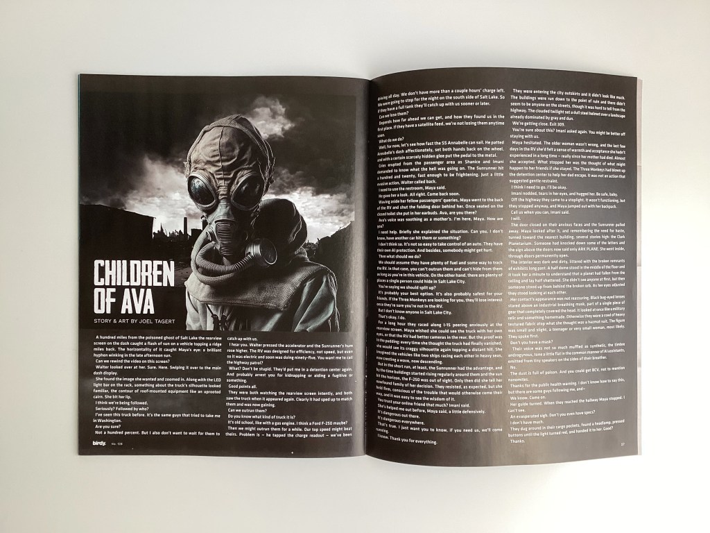 “Children of Ava” appears in Birdy 128, August 2024, with generative art by myself. Young Maya is on the run in the ruins of Salt Lake City–but her AI companion, Ava, has friends everywhere.