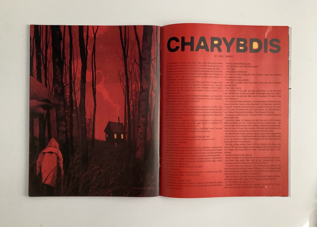 “Charybdis” spins and eddies in Birdy 131, November 2024, with art by Chris Austin. A resurrected assassin with a new neuroport finds that nothing is certain when AI superintelligences are involved.