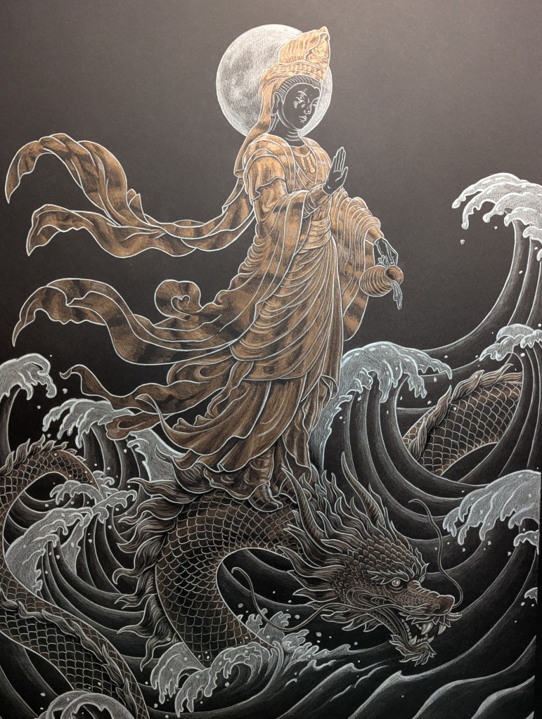 My drawings are particularly inspired by Himalayan and Japanese traditions of painting on black backgrounds, making special use of metallic gold pen and pencil on black paper for strikingly rich palettes and contrasts. The figures’ compositions likewise owe much to these traditions, along with nods to Buddhist lineages in Thailand, China and India, the flowing lines of Art Nouveau and the body-punch of Japanese tattoo design. At once lifelike and highly stylized, these figures glare and glide, leap and laugh. Fudo Myoo brandishes his sword and bugs his eyes in challenge; Manjusri bursts from the underbrush on a lion; Kannon surfs serene through the ocean tumult. Together they cry, “Wake up! Wake up! Wake up!”