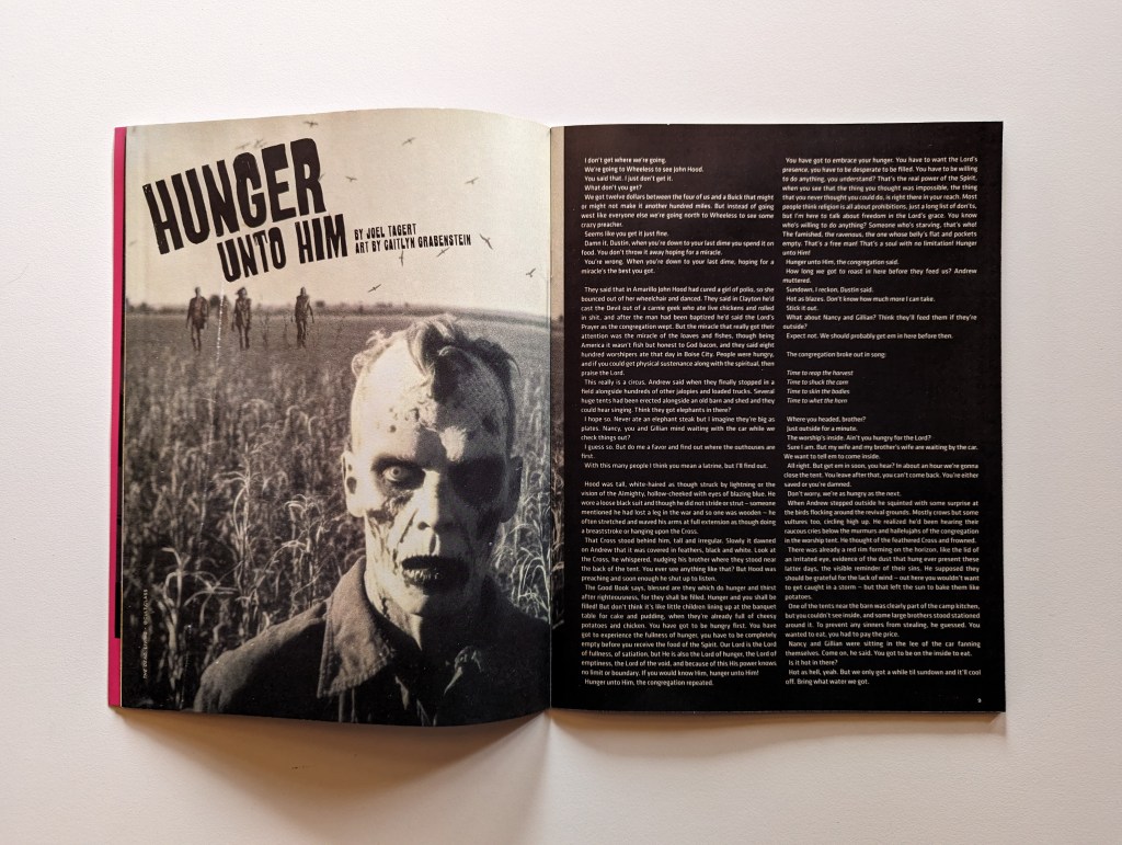 “Hunger Unto Him” appears in Birdy 118, from October 2023, with art by Caitlyn Grabenstein. This recipe calls for equal parts McCarthy, Steinbeck and King for a Depression-era feast: