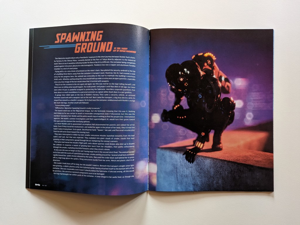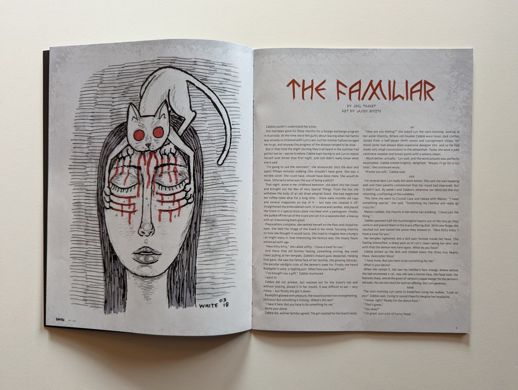 “The Familiar” appears in the February 2024 issue of Birdy Magazine, with art by Jason White (@jason_white_art).